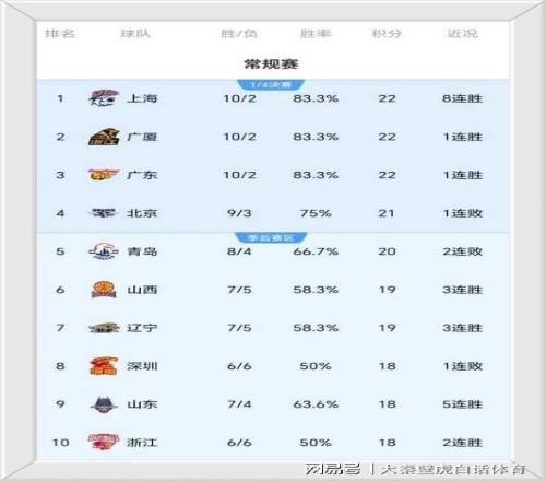 ①、前三名、上海男篮、广厦队和广东队都取得10胜2负的战绩排名前三;