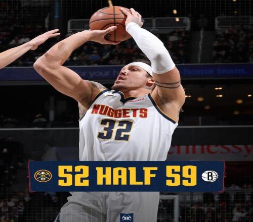 次节比赛,双方均是单节得分不足30分,掘金前4分钟追到38-38,篮网在波特引领下内外开花,掘金逐步以43-51落后。掘金继续被压制逐步以46-59落后篮网,掘金连追6分缩小差距,掘金单节23-26再输3分,上半场比赛结束掘金52-59落后篮网。前两节比赛,穆雷8分7助攻,波特16分7篮板3助攻。