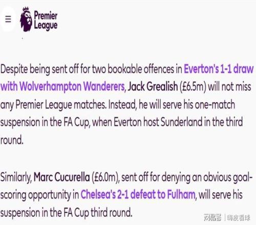 根据规则,累积黄牌而停赛,只能在英超赛场接受处罚,而得到红牌停赛的,可以在其他赛场。英超方面特别指出,虽然曼城借将格拉利什,代表埃弗顿的比赛中领到红牌,切尔西后卫库库雷利亚,因为阻止可能的进球而得到红牌,都不需要在英超停赛,而是在周末进行的足总杯中接受处罚。