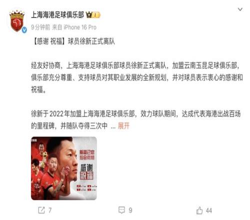 而在上海海港这边,球队几乎同时官宣了球员徐新加盟云南玉昆的消息,俱乐部发文称:“经友好协商,上海海港足球俱乐部球员徐新正式离队,加盟云南玉昆足球俱乐部,俱乐部充分尊重、支持球员对其职业发展的全新规划,并对球员表示衷心的感谢和祝福。”