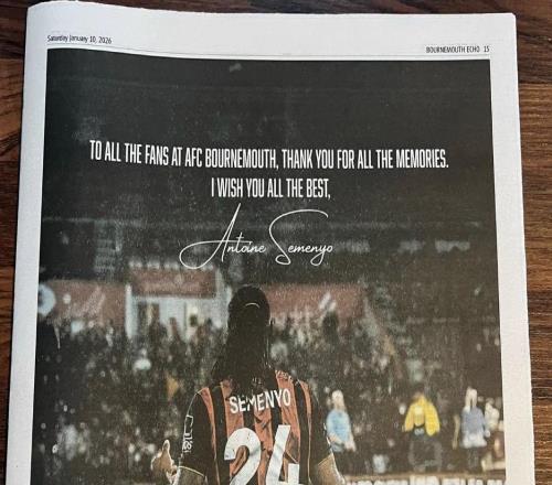 当地时间1月10日,已经转会曼城的塞门约在《伯恩茅斯回声报》上刊登了一整版广告,向伯恩茅斯的球迷表示感谢。...